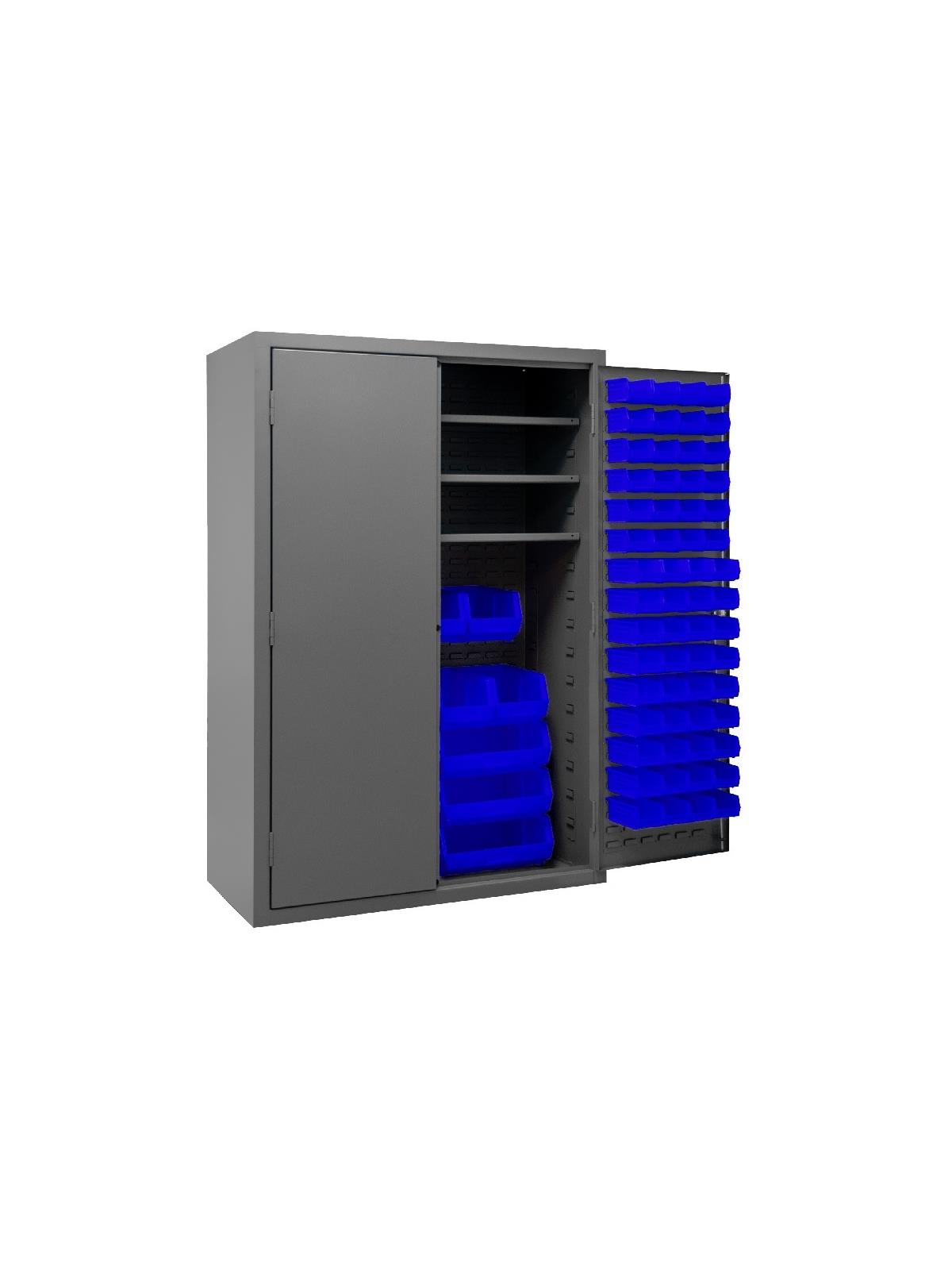 3-point locking system with keyed handle and lock rods, 4 keys included. Full height, formed and recessed doors with heavy duty, leaf hinges to prevent sagging and warping. Adjustable shelves rest on louvered panels and adjust on 4" centers. No tools required for installation. Fully welded louvered panels reinforce door and accommodate Hook-On Bins®. Hook-On Bins® installed easily with no tools required. Hook-On Bins® are included. Durable, gray, textured powder coat finish. Available in three bin colors, Red (-1795), Blue (-5295), or Yellow (-95). FOB Shipping Point.