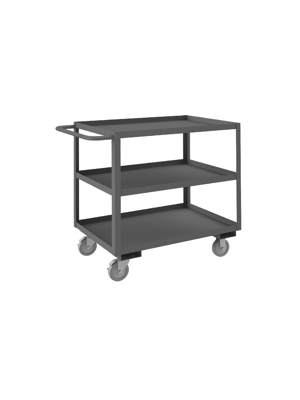 Shelf carts are constructed with 1-1/2" x 1/8" angle iron uprights for added strength. Heavy duty 14 gauge steel shelves. Sturdy tubular push handle. Perfect for transporting heavier parts or stock items. Shelf Stock Carts are available in 1,200 lbs. or 3,000 lbs. capacities. FOB Shipping Point.