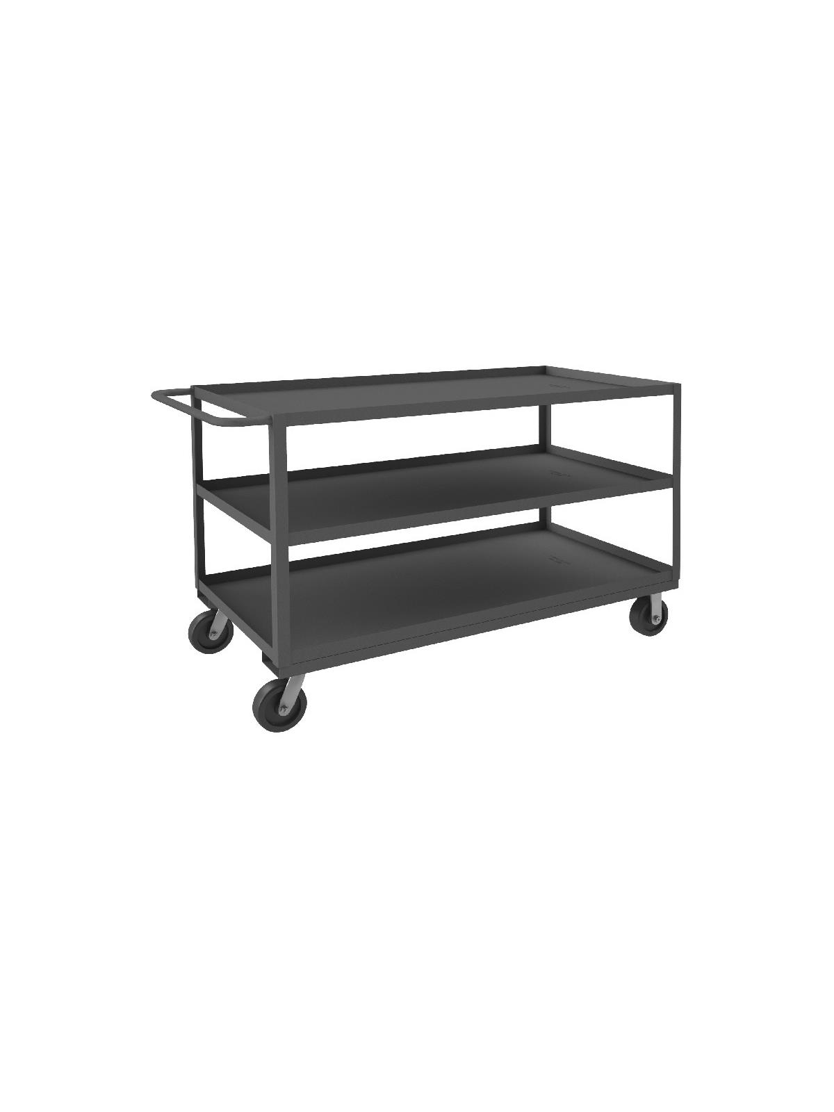 Shelf carts are constructed with 1-1/2" x 1/8" angle iron uprights for added strength. Heavy duty 14 gauge steel shelves. Sturdy tubular push handle. Perfect for transporting heavier parts or stock items. Shelf Stock Carts are available in 1,200 lbs. or 3,000 lbs. capacities. FOB Shipping Point.