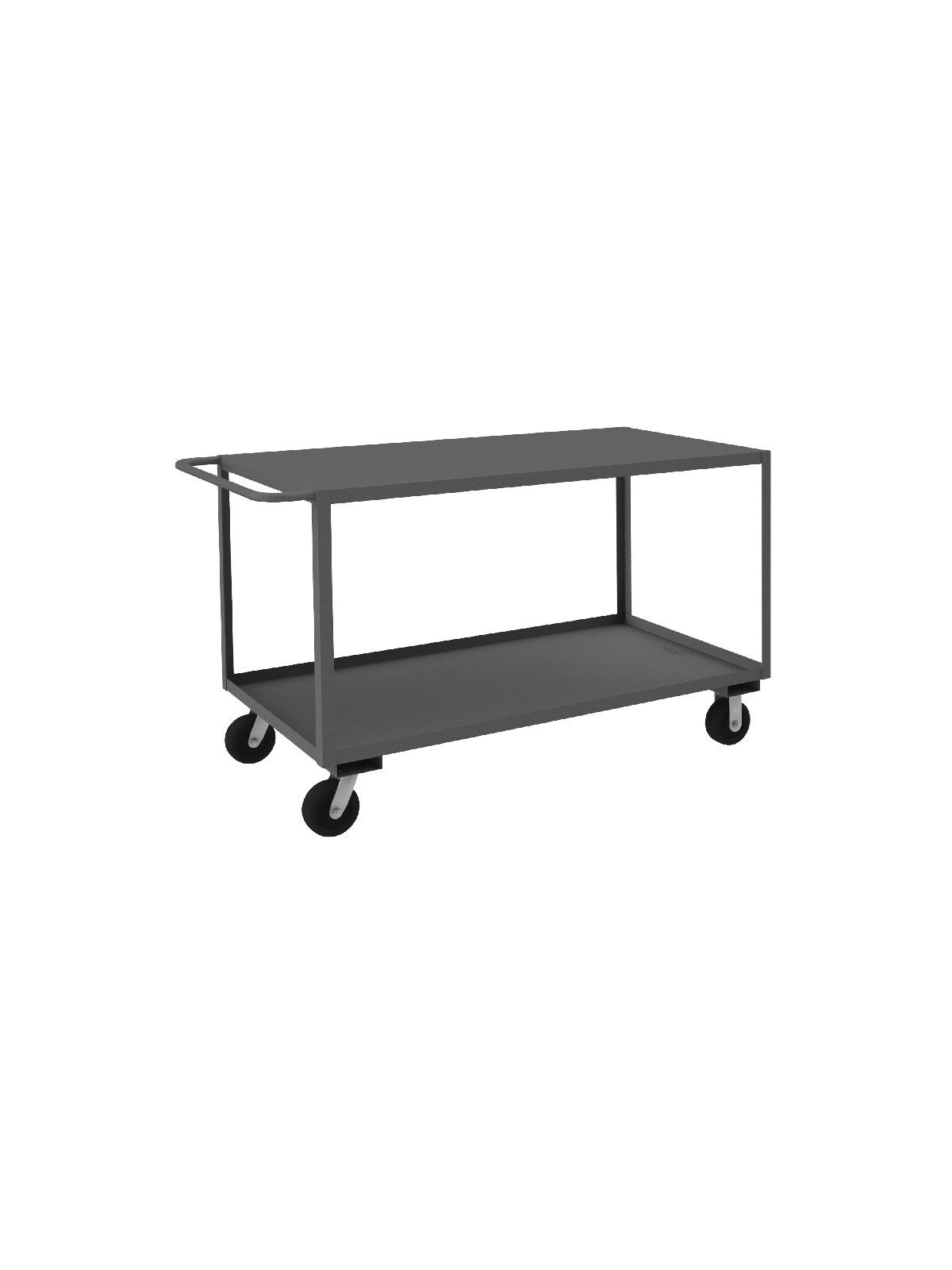 Shelf carts are constructed with 1-1/2" x 1/8" angle iron uprights for added strength. Heavy duty 14 gauge steel shelves. Sturdy tubular push handle. Perfect for transporting heavier parts or stock items. Shelf Stock Carts are available in 1,200 lbs. or 3,000 lbs. capacities. FOB Shipping Point.