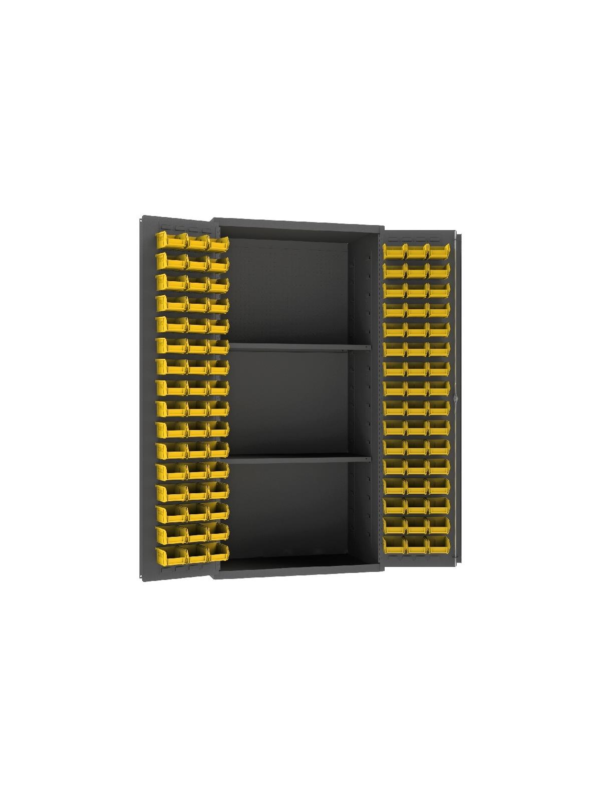 Large storage cabinets have heavy-duty leaf hinges to prevent warping and sagging. H3501-DLP-PB-96-2S-95 features louvered panels on doors to allow for bin storage of small parts and HEMDC-482472-PB-2S-95 features punched diamond pattern on doors for visibility and ventilation. Cabinets have two shelves that adjust on 4" centers - no tools required - and hold up to 700-1250 lbs. (weight evenly distributed) and feature a 3-point locking system with keyed handle and 5/16" dia. lock rods. Available in Gray powder coat finish. Ships fully assembled. FOB Shipping Point.
