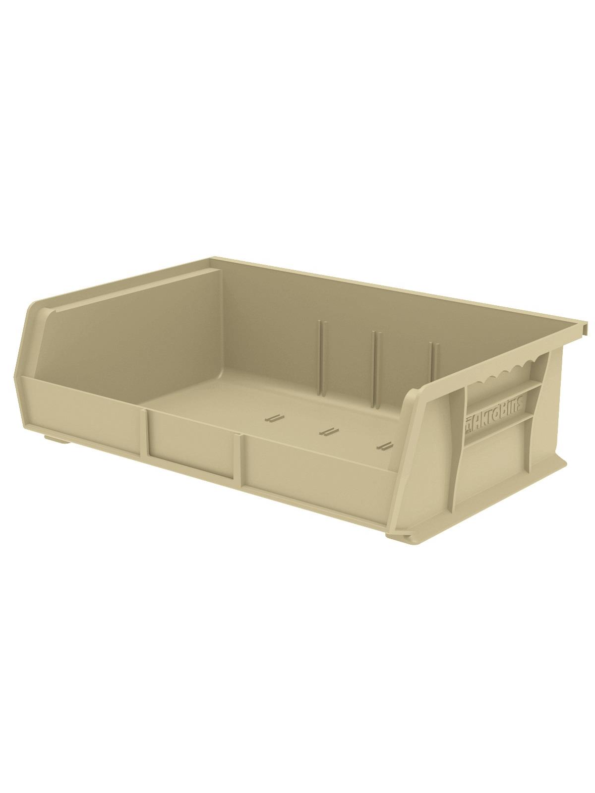 AkroBins are heavy-duty and securely stack on top of each other, sit on shelving, and hang from Akro-Mils racks, panels, rails and carts. Unaffected by weak acids and alkalis the sturdy one piece construction is water, rust and corrosion-proof. Finger grip allows for easy handling. Large label slot for easy identification of contents. Autoclavable up to 250° F. Guaranteed not to crack or break under normal load conditions as stated in the 1-year limited warranty. Optional dividers and labels available, see Related Items tab. AkroBins available in Red, Yellow, Blue, Green, Black, Stone, and Semi-Clear. FOB Shipping Point.