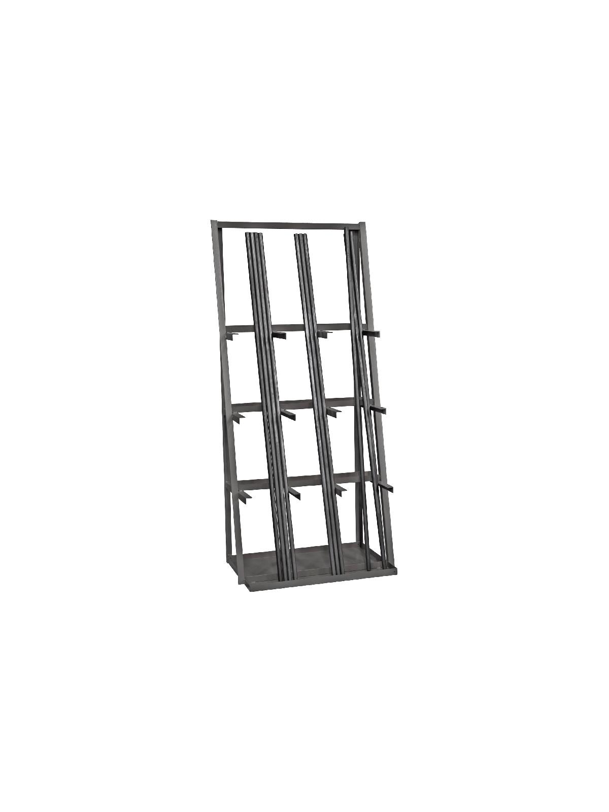 Vertical Bar Rack All welded construction with 3000 lbs. capacity. Heavy duty angle iron frame and arms with 14 gauge steel shelves. Shelves are 5-1/4"D. x 36" W. Pan base is 24 x 36" and has a retaining lip to hold parts in place. Perfect for storing long parts like threaded rod, pipes or strut. Unit ships fully assembled ready for use and has a durable gray textured powder coat finish. Threaded Rod Rack Separates and protects threaded rods in 18 sections - each section 2-1/16" dia. Multipurpose Bin Removable vertical dividers allow the creation of double-width openings, each with scoops. Can be wall mounted.
