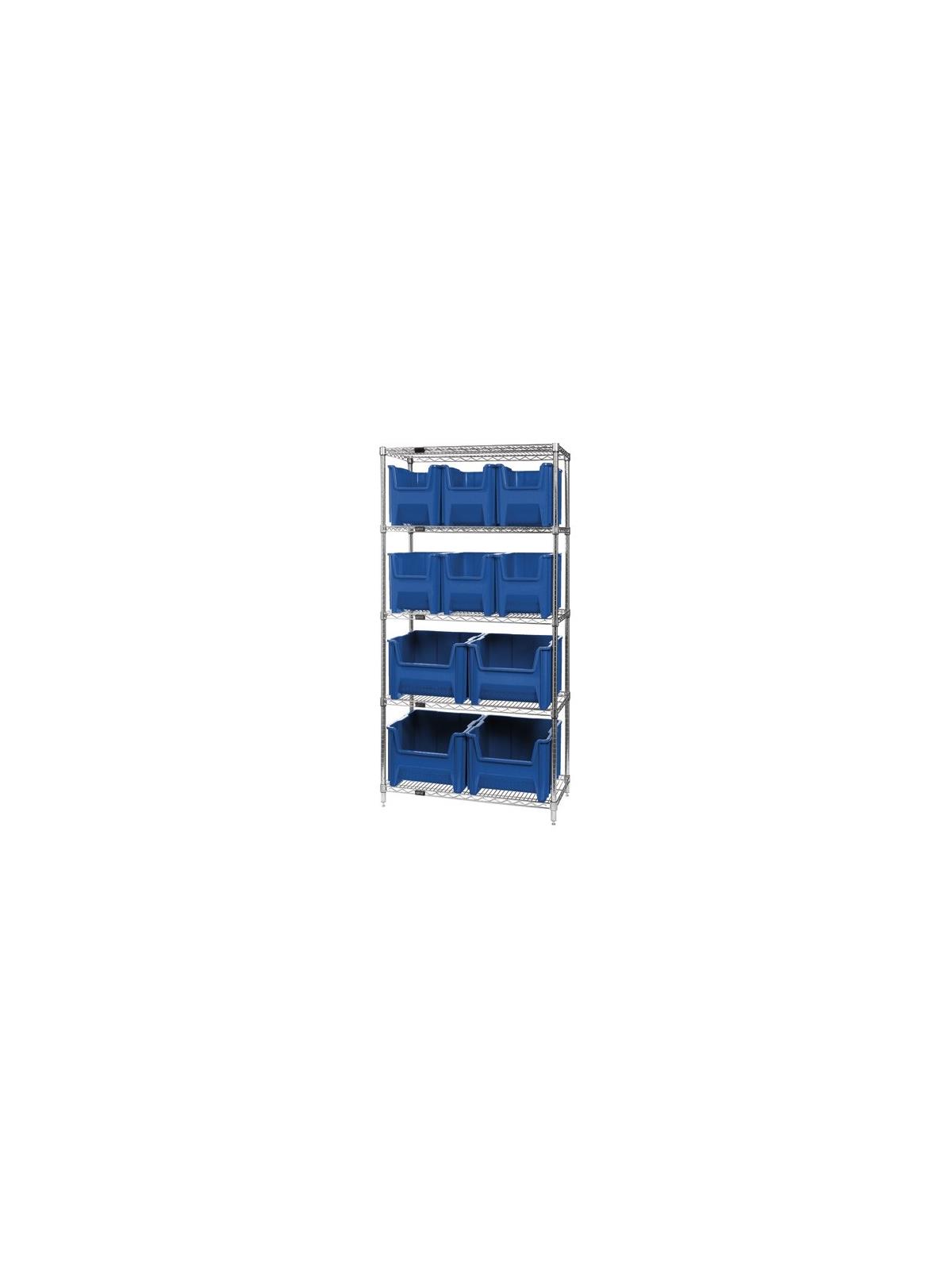 Combine stylish chrome shelving and parts organizing bins. Sturdy shelving unit supports loads up to 800 lbs. Choice of bins. Easy to assemble. Giant Hopper Bins are available in Gray, Blue, or Red. FOB Shipping Point.