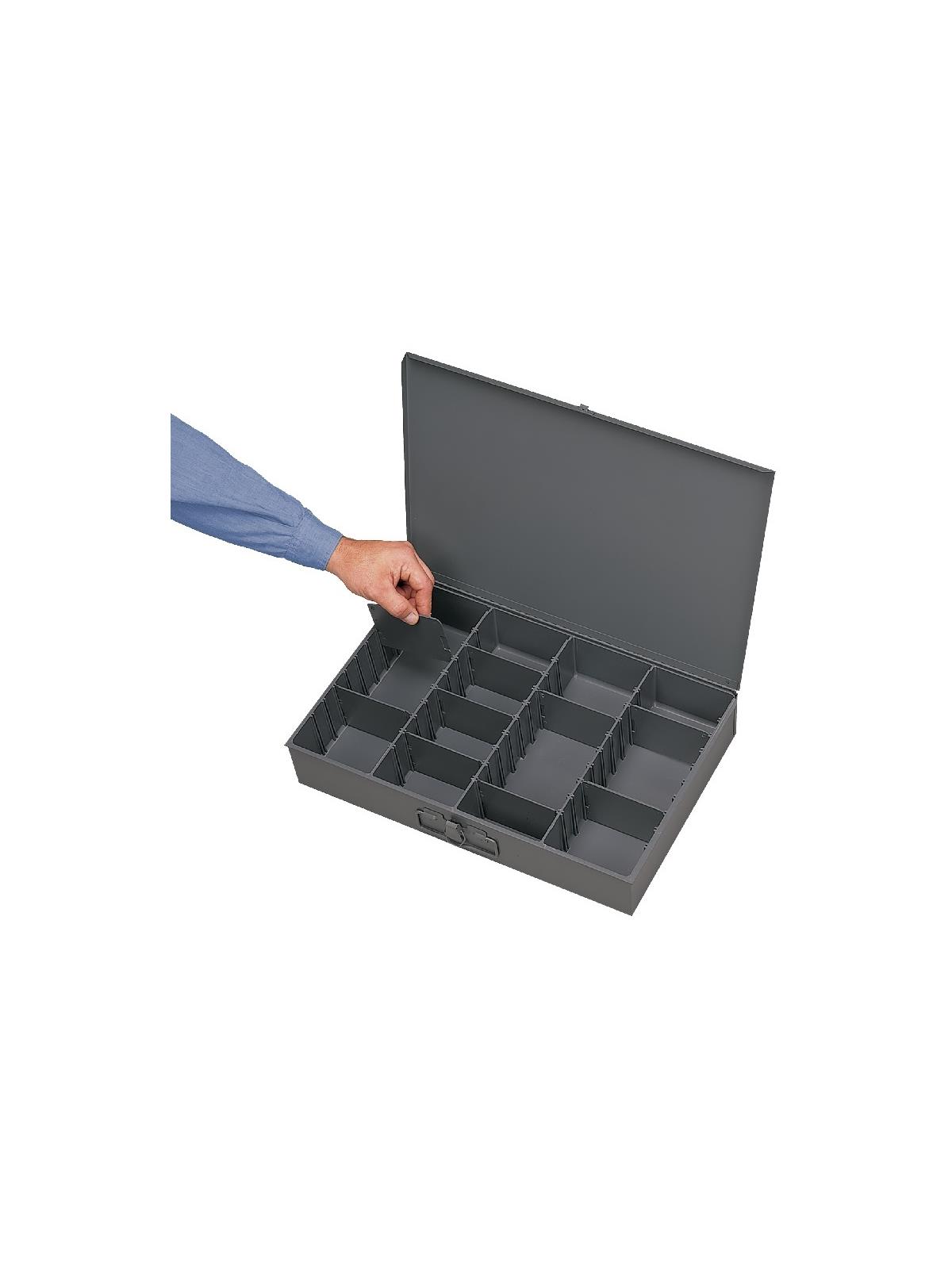 Efficient storage and organization for a variety of parts and components. Each compartment box interior is manufactured of polypropylene with scooped bottoms, both front and back for easy parts removal. Rugged steel, all-welded cabinets are reinforced for rigidity. Use on the workbench, counter or carry to the job site with convenient thumb-grip handles. Finished in acid and rust resistant Gray powder coating. FOB Shipping Point.