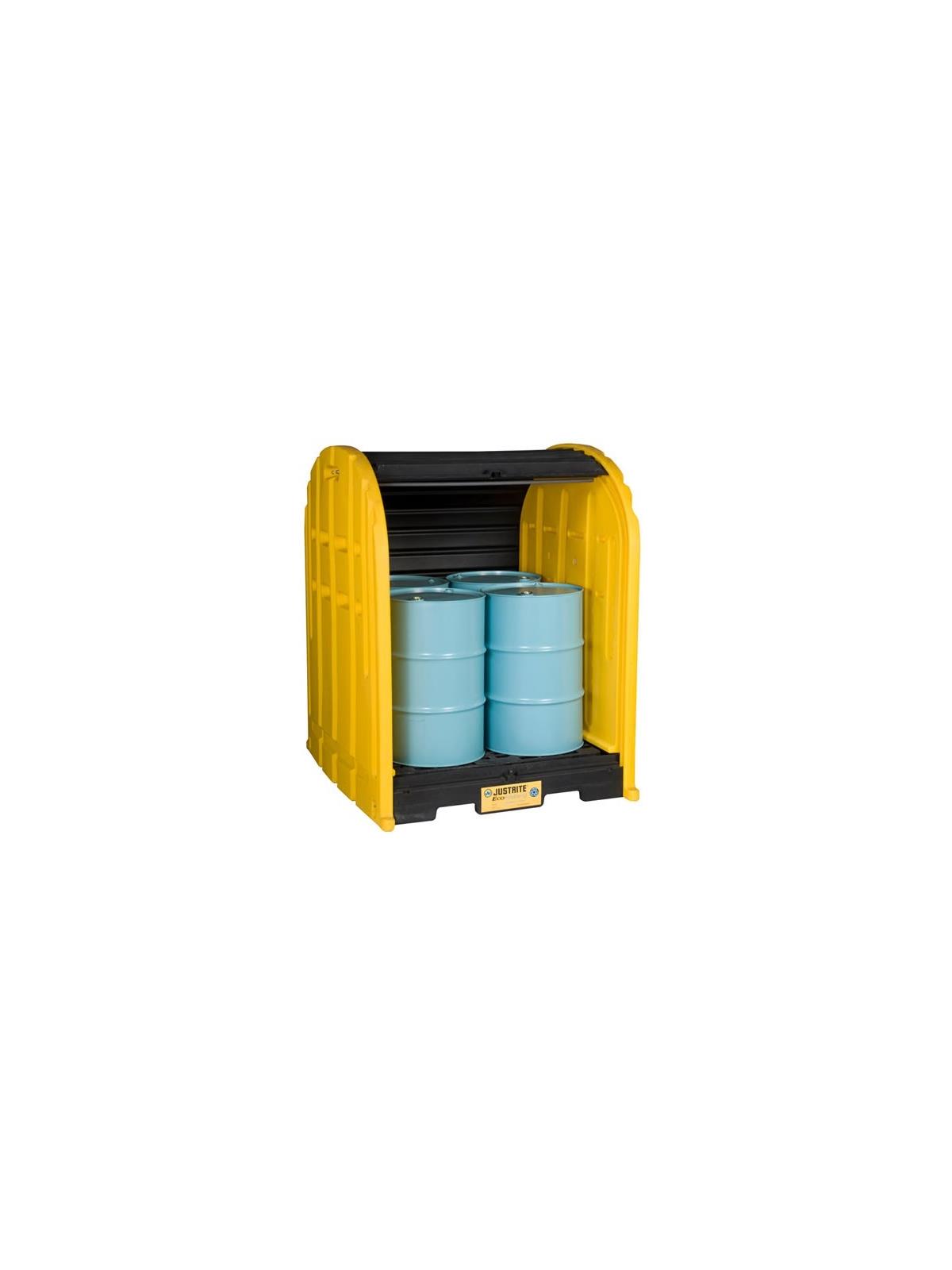 These weather resident outdoor DrumSheds™ offer you high performance spill control and help reduce landfills by using recycled products. Features convenient roll top doors allowing access from front or rear. Forklift pockets front and back make it easy to relocate empty sheds. The EPA/SPCC compliant leak proof pallet sump features thick, durable deck grating which removes for easy inspection and clean up of spills. A spacious interior offers ample head space to accommodate working operations with funnels or pumps. Safety features include grounding capability and integral anchor bolt locations for wind resistance. Molded in lugs accept padlocks for security. Ships fully assembled to save on set-up time. Optional ramp simplifies drum placement. Exceeds EPA, SPCC, NFPA1, and the Int'l Fire Code. FOB Shipping Point.