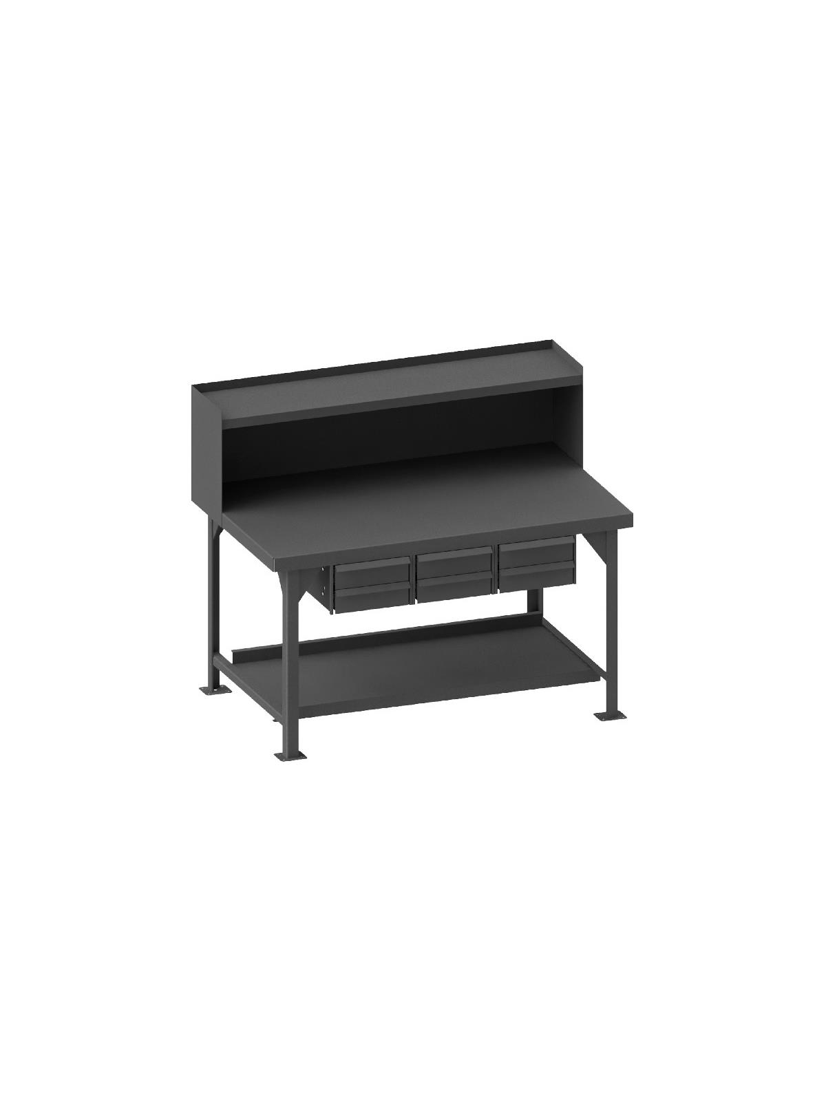 Products with top shelf risers used as shelf and back splash. See Related Items tab for Drawer for Durham Work Benches. FOB Shipping Point. Steel surcharges may apply.