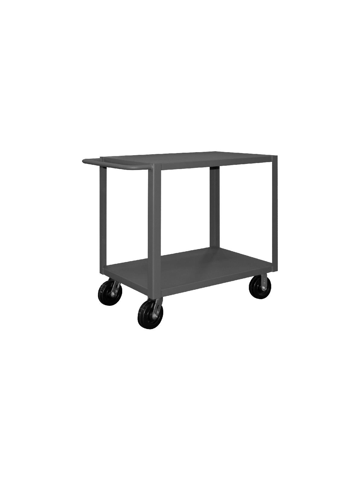 Heavy Duty Portable Tables have a 2" x 3/16" angle iron frame for added strength. Shelves are reinforced and have lips down. (2) swivel and (2) rigid bolt-on casters. Sturdy tubular push handle for easy maneuverability. 4,000 lbs. capacity unit has welded 14 gauge steel shelves with channel formed sides. 5,000 lbs. capacity unit has welded 12 gauge steel shelves. FOB Shipping Point. Steel surcharges may apply.