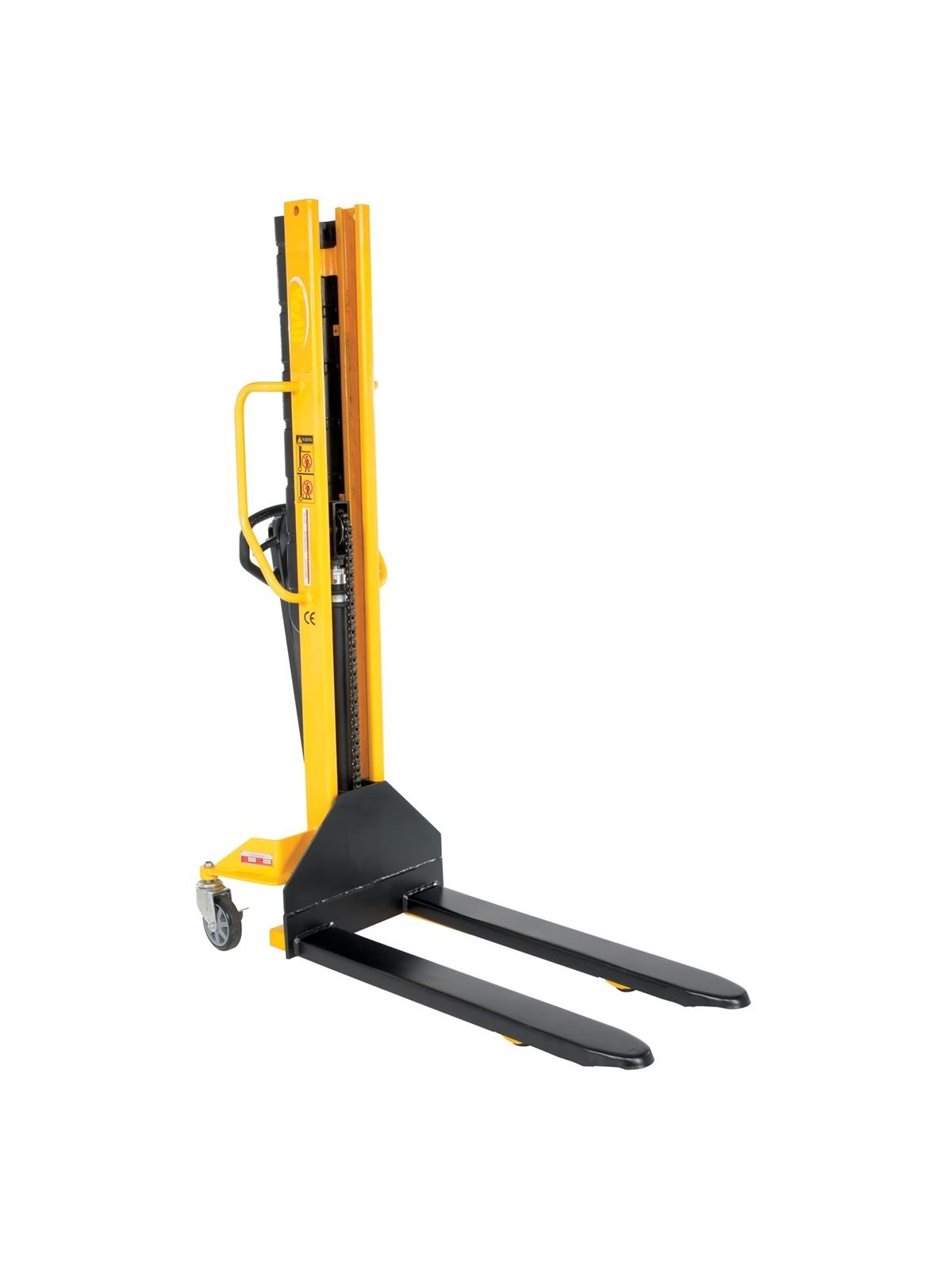 Manual Hand Winch Stackers feature a heavy duty mast and unique winch design for easier and safer lifting. Lift and lowered by hand winch and steel cable mechanism. 3/4" lift per handle revolution.