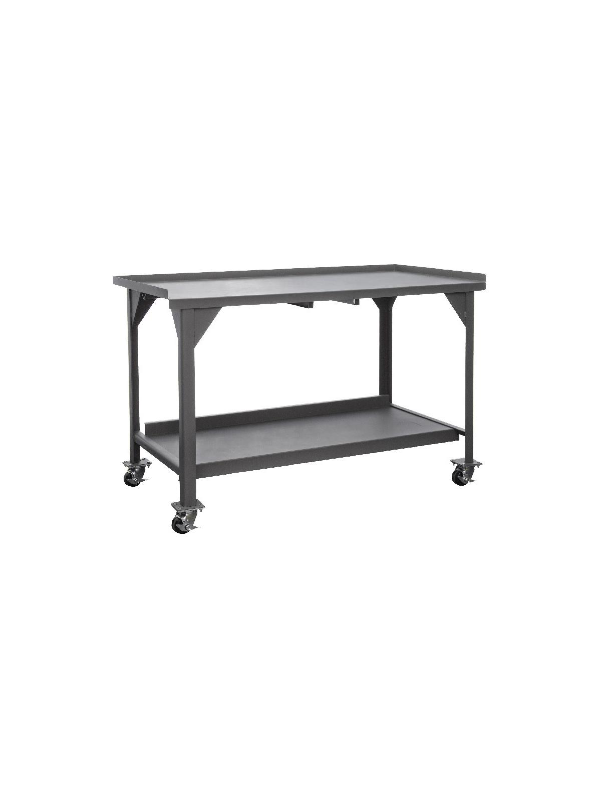 Workbench top is 12 gauge thick reinforced steel. Has angle iron stiffener under work surface and 2" x 2" x 1/4" angle iron legs. Mobile units (DWBM) include (4) 3" phenolic, locking swivel casters. Back and end stops. All units have provisions for optional drawer to be added. Work surfaces are 34" above the floor. All models include a 12 gauge steel lower shelf with 500 lbs. capacity. Foot pads with predrilled holes allow for lagging to the floor. FOB Shipping Point. Steel surcharges may apply.
