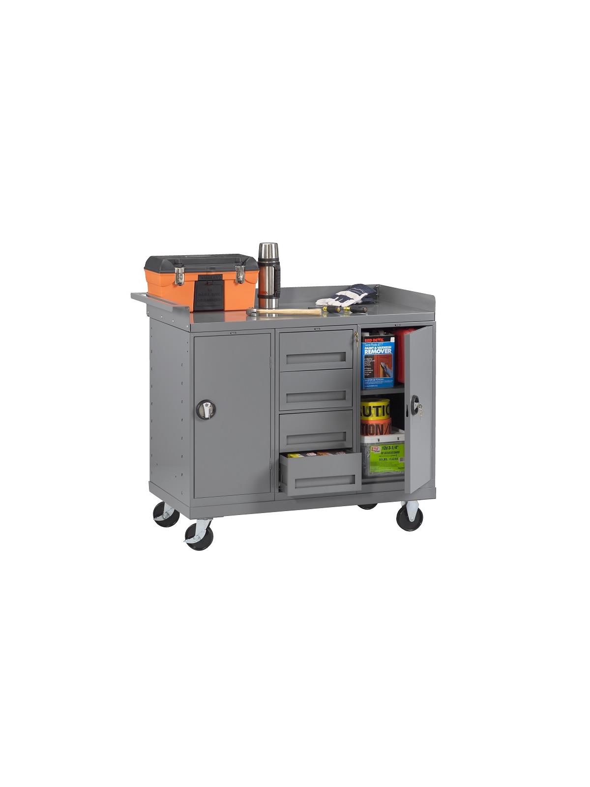 Designed to easily move heavy parts and tools to your worksite. Mobile Workbenches feature all-welded construction from heavy gauge steel. Side and Back Rail add 3" to overall workbench height. Medium Gray in color. FOB Shipping Point.
