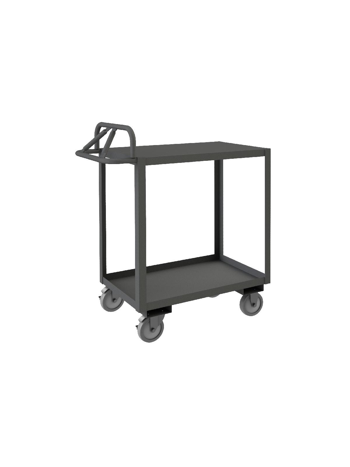 Constructed with 1-1/2" x 1/8" angle iron uprights for added strength. Heavy duty 14 gauge steel shelves. Sturdy, tubular, ergonomic handle has 3 positions ensuring maximum comfort. Standard units have 1-1/2" lips. ALD units have all lips down, TLD units have top lips down. Durable, gray, textured powder coat finish. FOB Shipping Point.