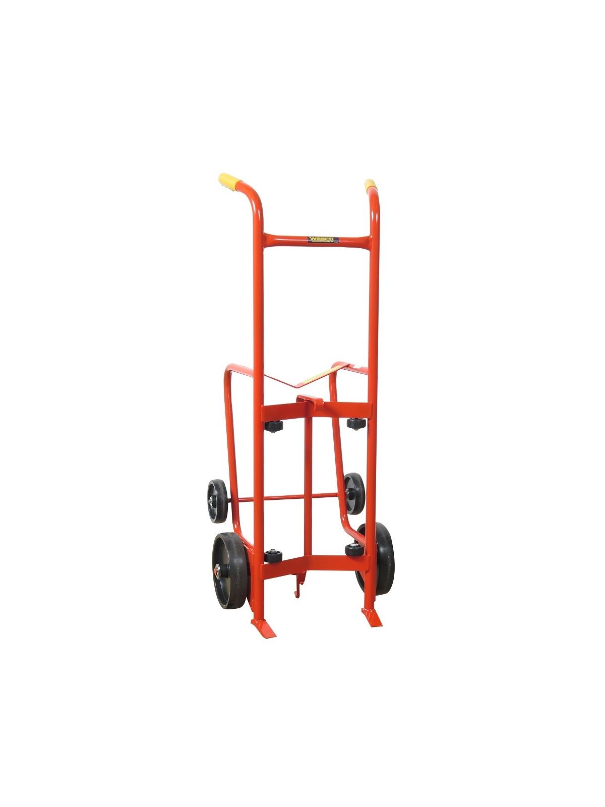 All trucks can be stored in the upright position. Safe, one-man handling of heavy 55 gal. drums. Features vinyl hand grips. FOB Shipping Point. Steel surcharges may apply. A) Floating Axle Ergonomic Drum Truck Easier drum truck for one person to handle. Floating axle reduces effort required to break over and balance the load. Chime hook can be stored at the top of frame. Self-standing. Replaceable hard double-beveled nose prongs. B) Economy Series Drum Truck (not shown) Affordable and durable. Angular steel base design. Kickstand. 24"W. at handle. 16.25"W. at nose. C) Standard Series (not shown) Machined steel load wheels behind nose prong help ease the lifting of drum. Classic single bar frame design. Kickstand. 24"W. at handle. 16.25"W. at nose. D) Deluxe Series Four Wheel design enables user to quickly and easily load and unload drums from pallet. Rear 6" wheels stabilize the load for effortless transport. Replaceable hard double-beveled nose prongs. Self-storing chime hook. Kickstand. 16.25"W. at nose. E) Ergonomic Drum Truck (not shown-similar to Deluxe Series, but with rear swivel casters) Ergonomic swivel caster design reduces operator muscle strain and fatigue. Swivel casters allow for smooth and tight turns in congested areas and provide 4 wheel support. Not recommended for use with pallets. Replaceable hard double-beveled nose prongs. Kickstand. 16.25"W. at nose. F) Drum Truck w/ Drain Stand Multi-functional drum truck allows four wheel drum handling and acts as a drum cradle for storage or dispensing. Frame clearance for dispensing into 5 gal. pails. Real axle allows for loading and unloading of drums from pallets. Kickstand. 16.5" drain height. FOB Shipping Point.