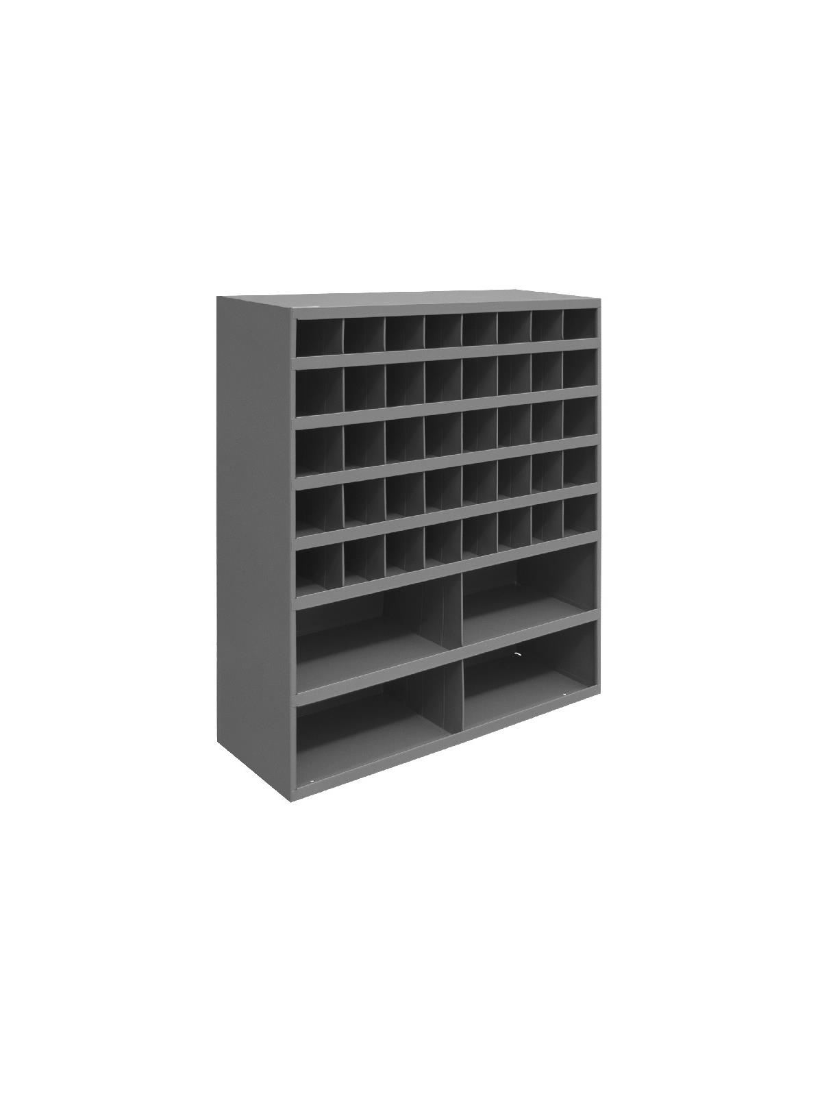 Roll-formed sides for increased strength and stability. Newly redesigned slope shelves. Ribbed and hemmed dividers provide added strength. Optional base available. Ships fully assembled ready for use. Durable gray powder coat finish. FOB Shipping Point. Steel surcharges may apply.